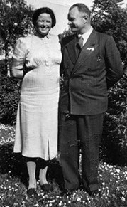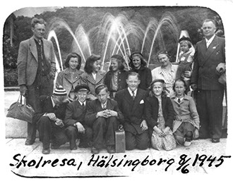 Helsinborg 1945, kylässä opettaja Agnes Rosenbergin koulussa, valkopaitainen opettaja istuu seisovan siskoni Tarjan vieressä sekä isä.
