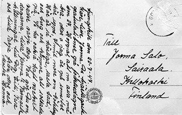 Kortti Jorman syntymäpäiväksi 27.7.1947. Yhteydet olivat kirjeet ja puhelin. Kirjeet äiti kirjoitti ja tätini Anna Packalen käänsi ruotsiksi. Puhelimella soitettiin, että Jormakin saisi puhua. Isän kuoltua 1957 äitini muutti Lindköpingiin Ruotsiin ja eli siellä 32 vuotta pitäen edelleen yhteyttä Ebbie Rosenbergin kanssa.