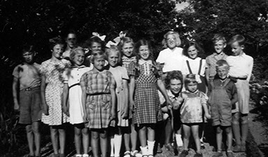 Rosenbergin perhe järjesti sotalapsi Tarjalle ja äidilleni tulopäivänä juhlat, kylän lapsia oli kutsuttu mukaan. Äitini kyykyssä, Tarja vieressä ja sotalapsi veli Jorma Tarjan vieressä oikealla.